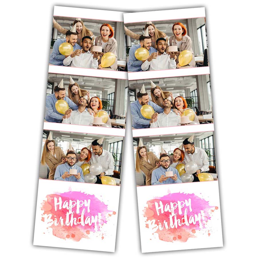 Bei Fotostreifen empfehlen wir Ihnen das „Fotobox PREMIUM“ Paket mit Profidrucker. Der Profidrucker schneidet zwei Streifen (je 5 × 15 cm) im Druckwerk. Die Druckzeit beträgt ca. 15 Sekunden pro Shot, im Vergleich zum Canon-Drucker des „Fotobox PLUS“ Pakets (ca. 50 Sekunden). Beim Canon-Drucker müssen die Streifen mit einer Schere durchgeschnitten werden.